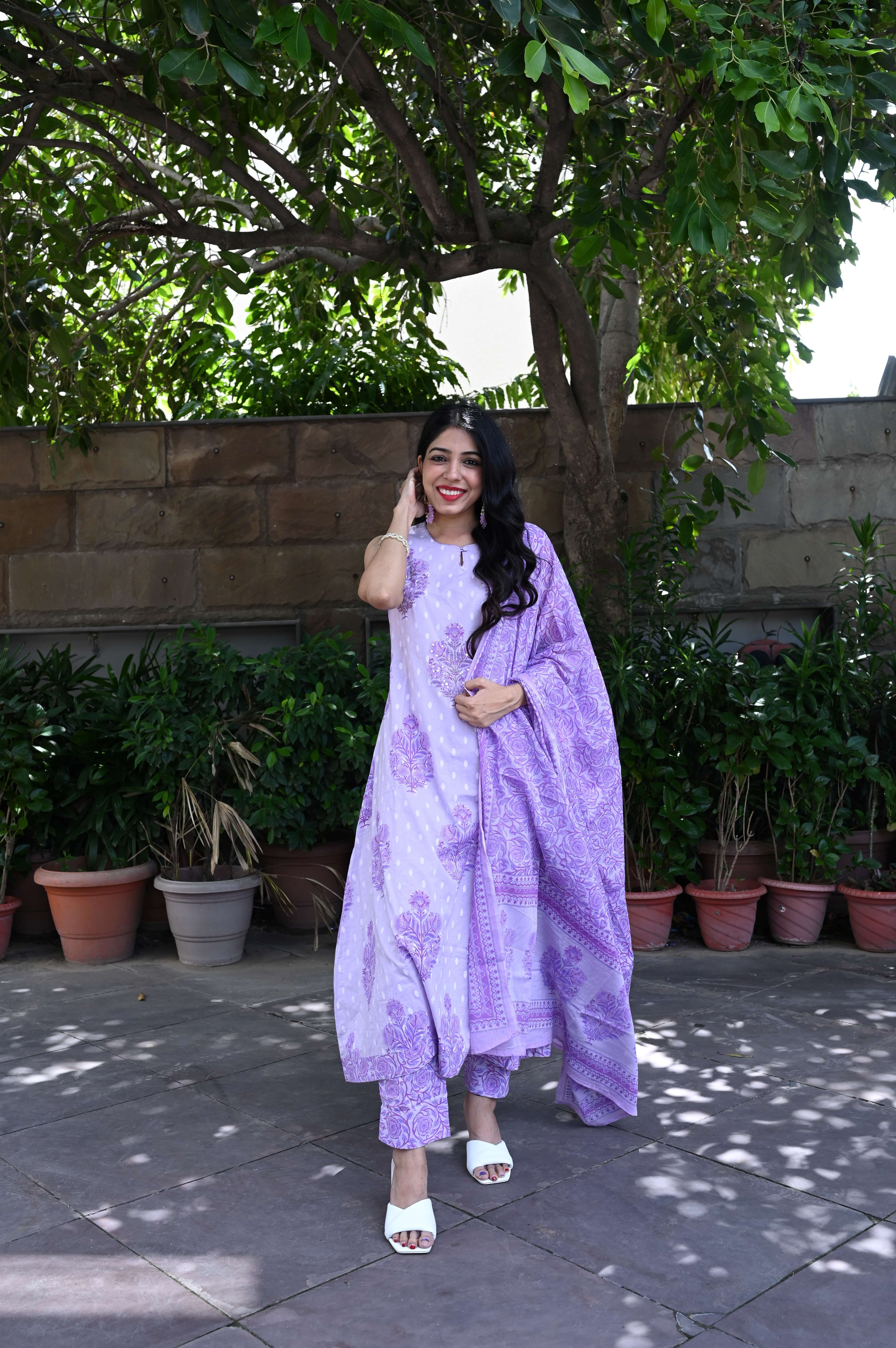 Enhance your festive wardrobe with our Lavender Handblocked Printed Suit Set. Made with 100% cotton, this kurta features intricate tubelight handwork and a beautiful handblocked print. The matching pant and handblocked printed dupatta complete the elegant look. Perfect for any occasion, this set will keep you comfortable and stylish all day long.